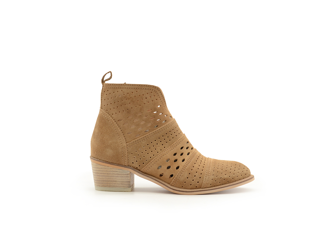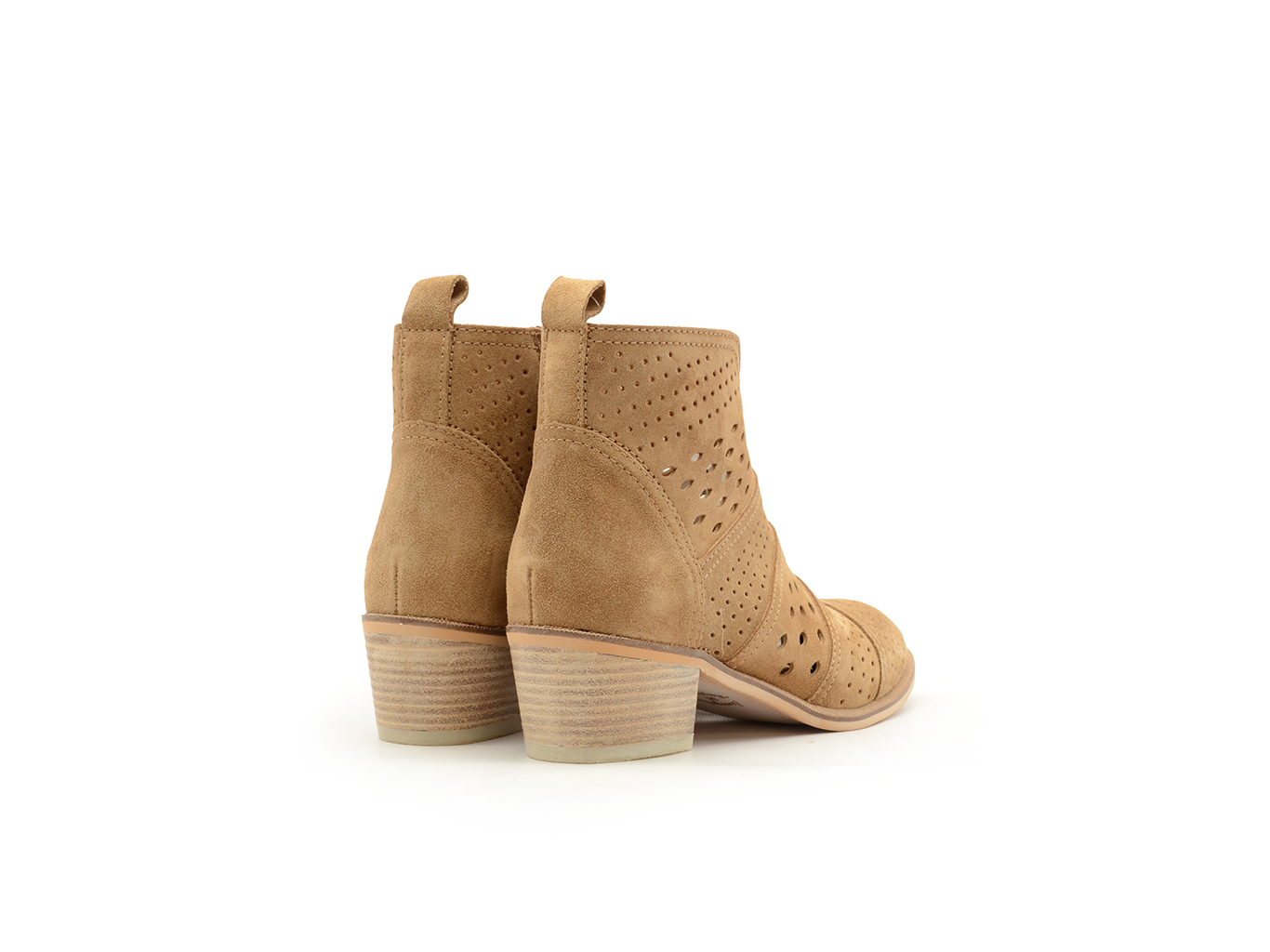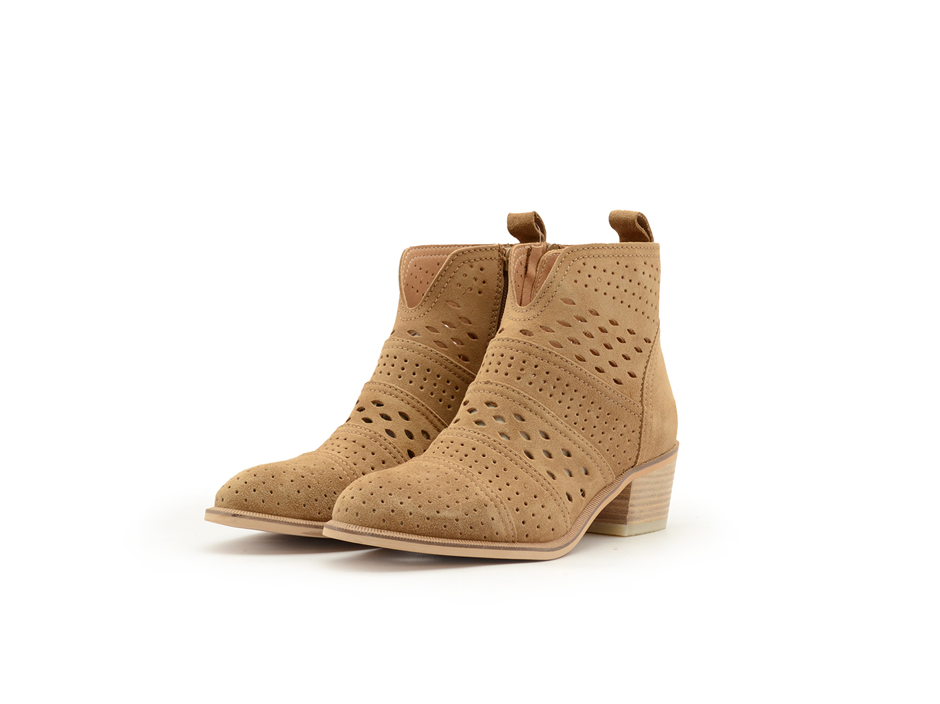 Stivaletti realizzato in camoscio color cuoio. Pellame traforato. Tacco di 5 cm, suola antiscivolo e punta tonda, con chiusura a zip e alto alla caviglia.