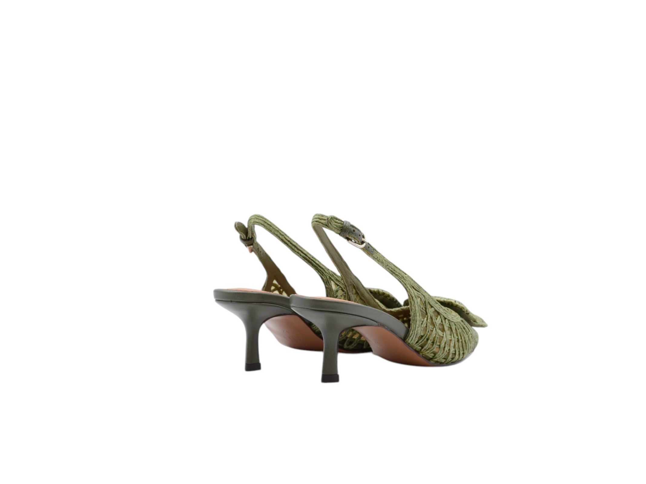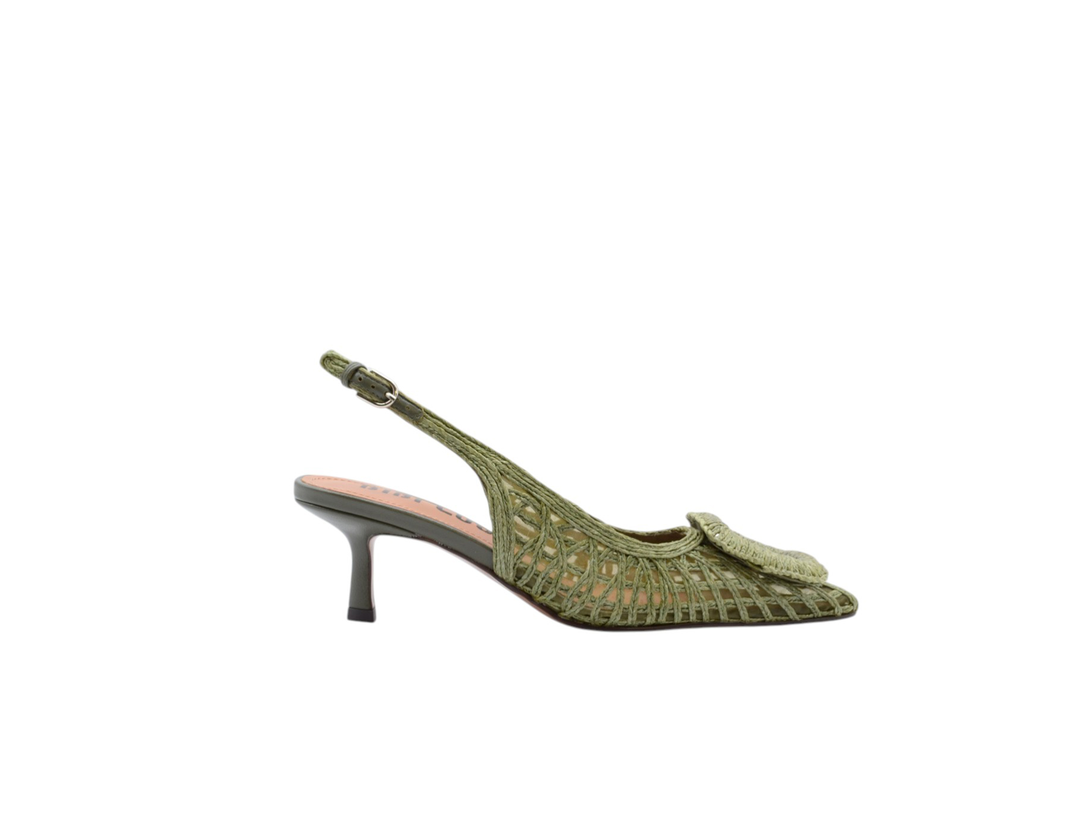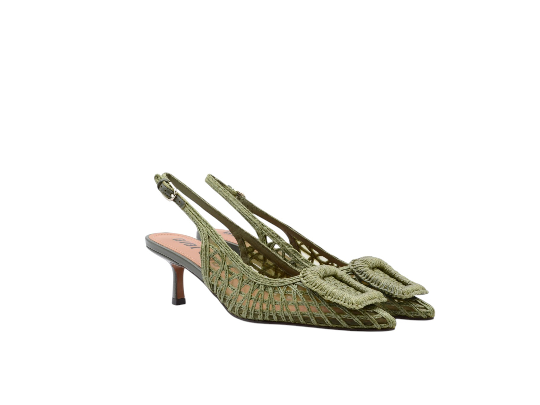 Chanel tacco 50 rocchetto. Tomaia in rafia verde con fibbia in tinta.Forma sfilata