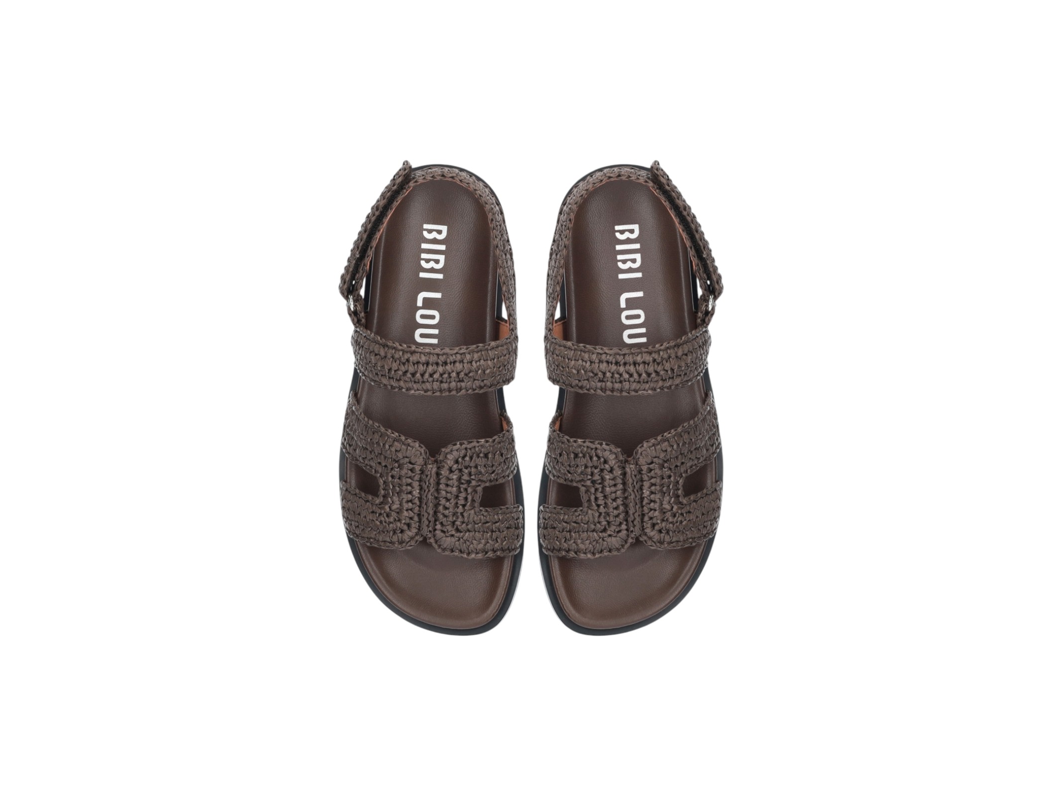 Sandalo effetto rafia color testa di moro con cinturino regolabile sul tallone. Suola in gomma. Fussbett ricoperto in pelle.