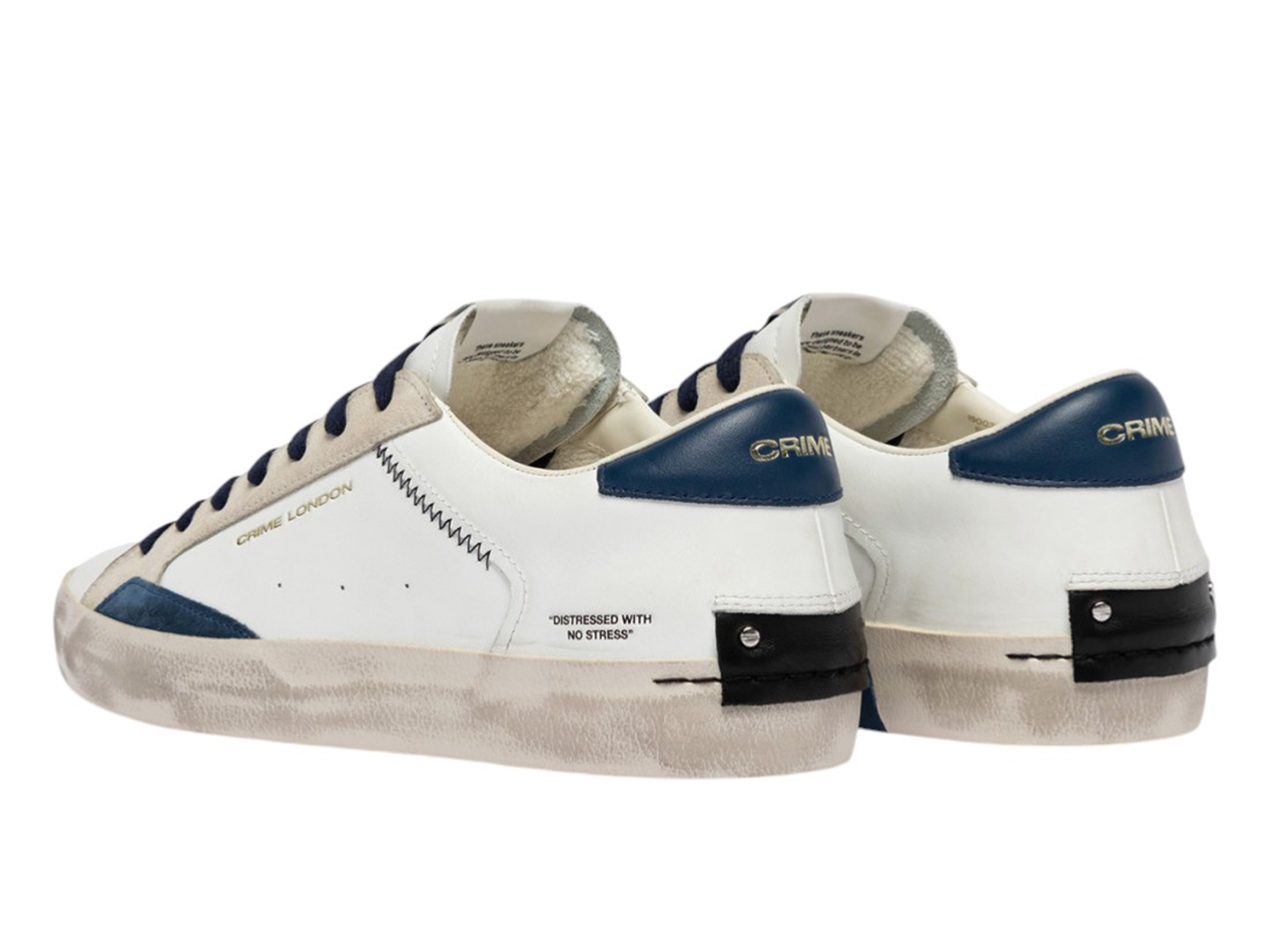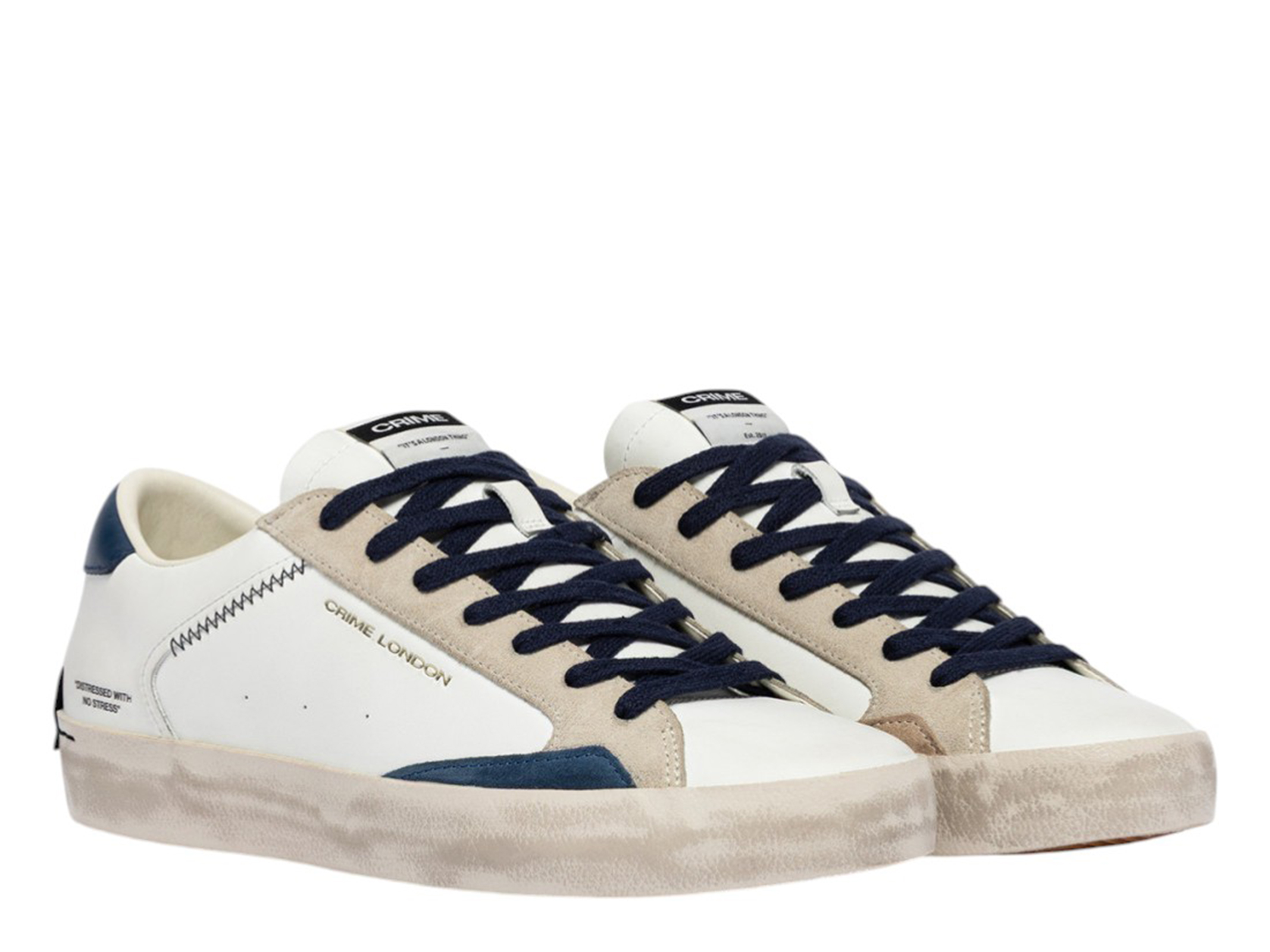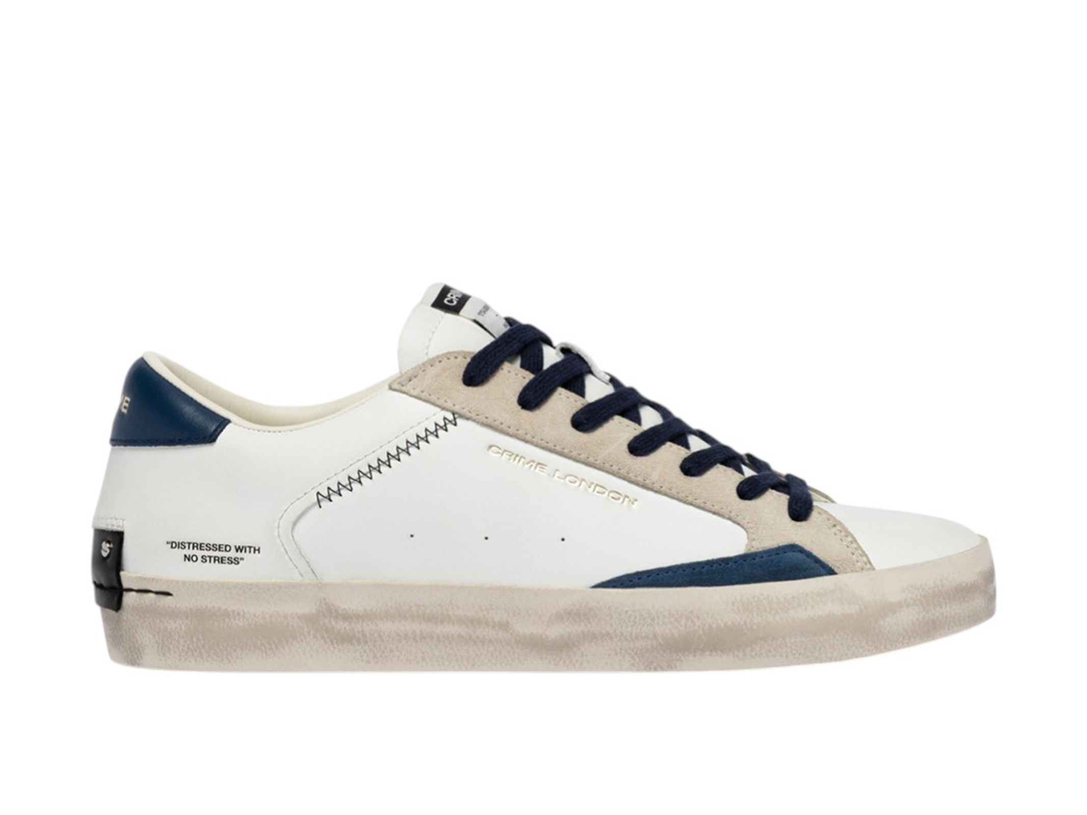 Tennis con tomaia in pelle bianca e dettagli in avio e camoscio ghiaccio.Suola in gomma stile vintage