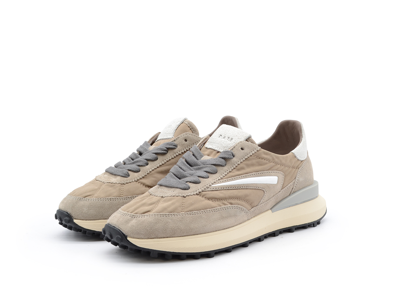 I lacci sono in cotone.Il logo quadrato è ricamato sul talloncino in suede hairy colore bianco.