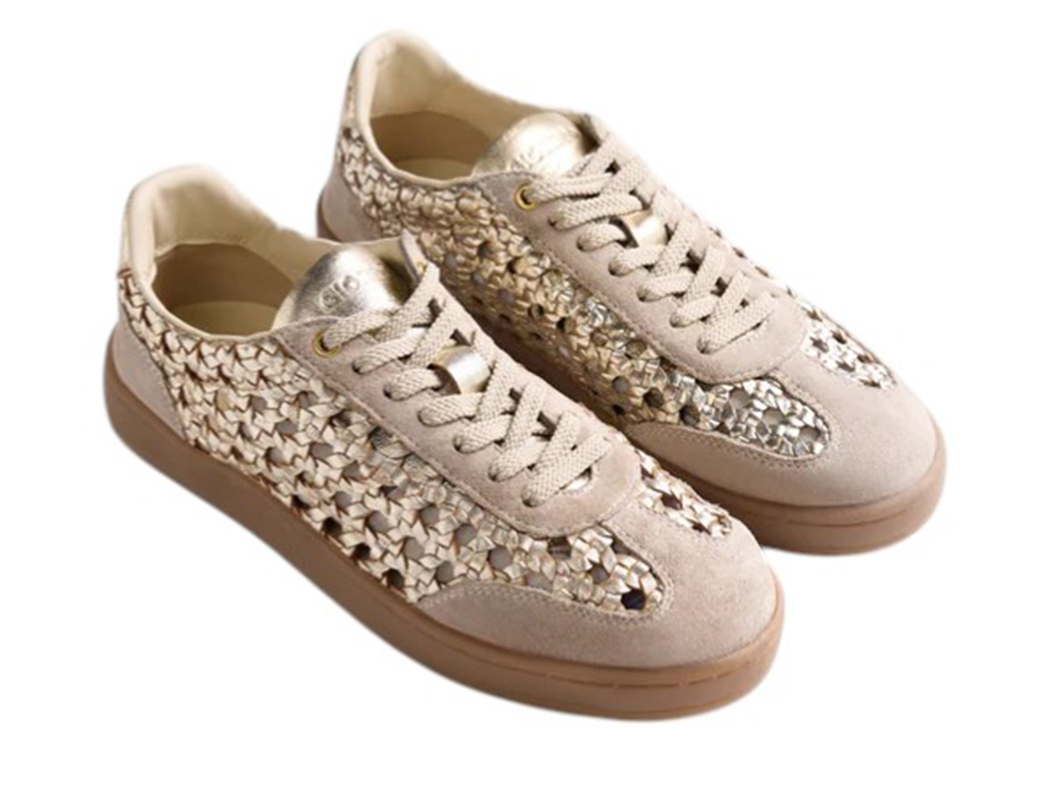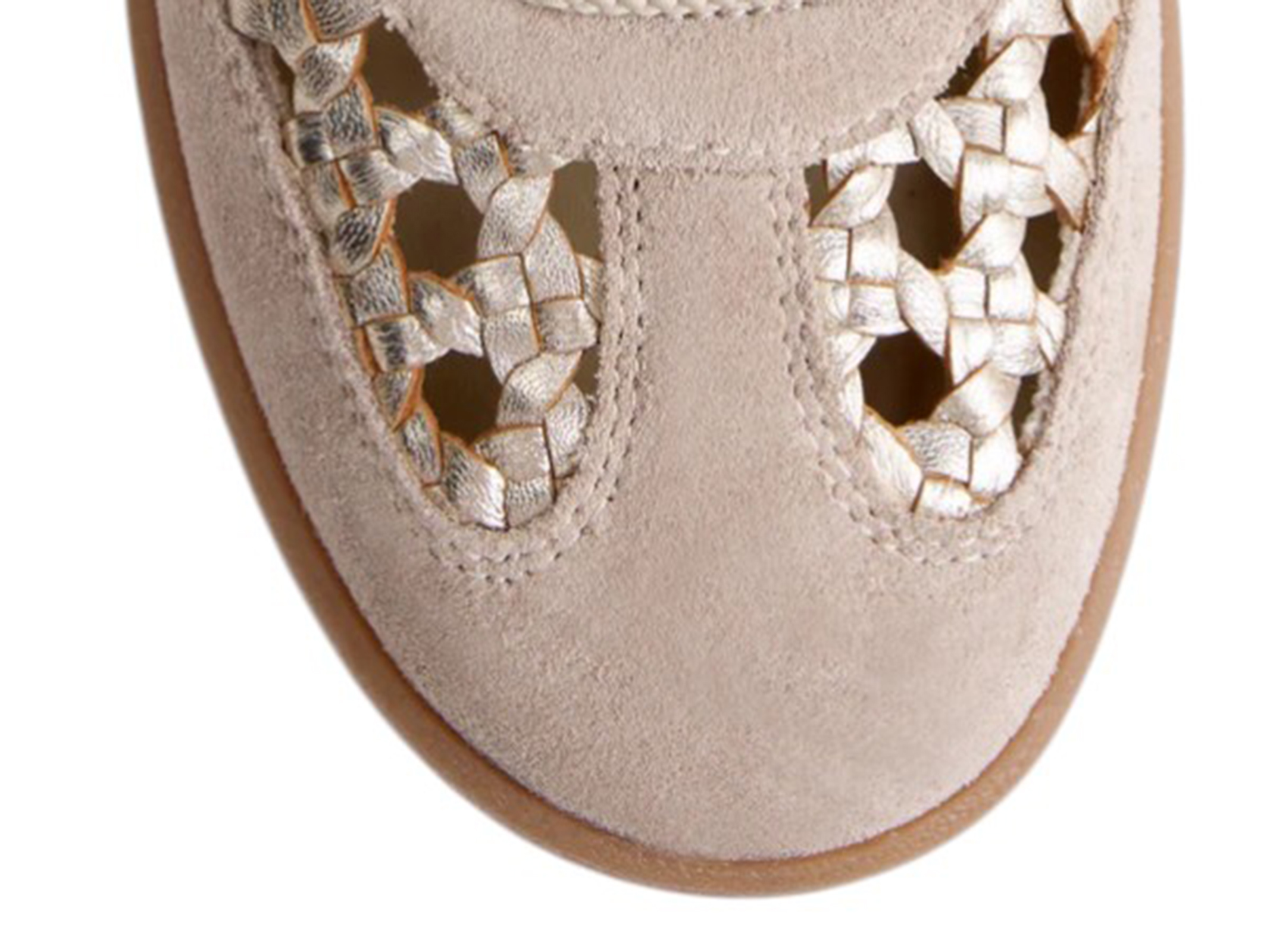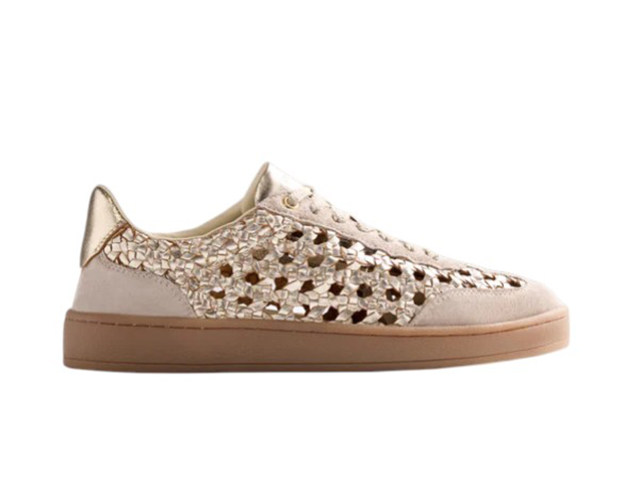 Sneakers in pelle intrecciata a mano con finitura metallizzata e inserti in suede. Presentano un sottopiede imbottito e termoformato per distribuire uniformemente il peso del corpo su tutta la pianta. Altezza plateau: 3 cm. Eventuali variazioni nella pelle o nella finitura tra un piede e l'altro riflettono l'autenticità del processo artigianale e l'utilizzo di pellami naturali. Tomaia e sottopiede in pelle. Fodera in pelle e morbido cotone. Suola in TPR.
