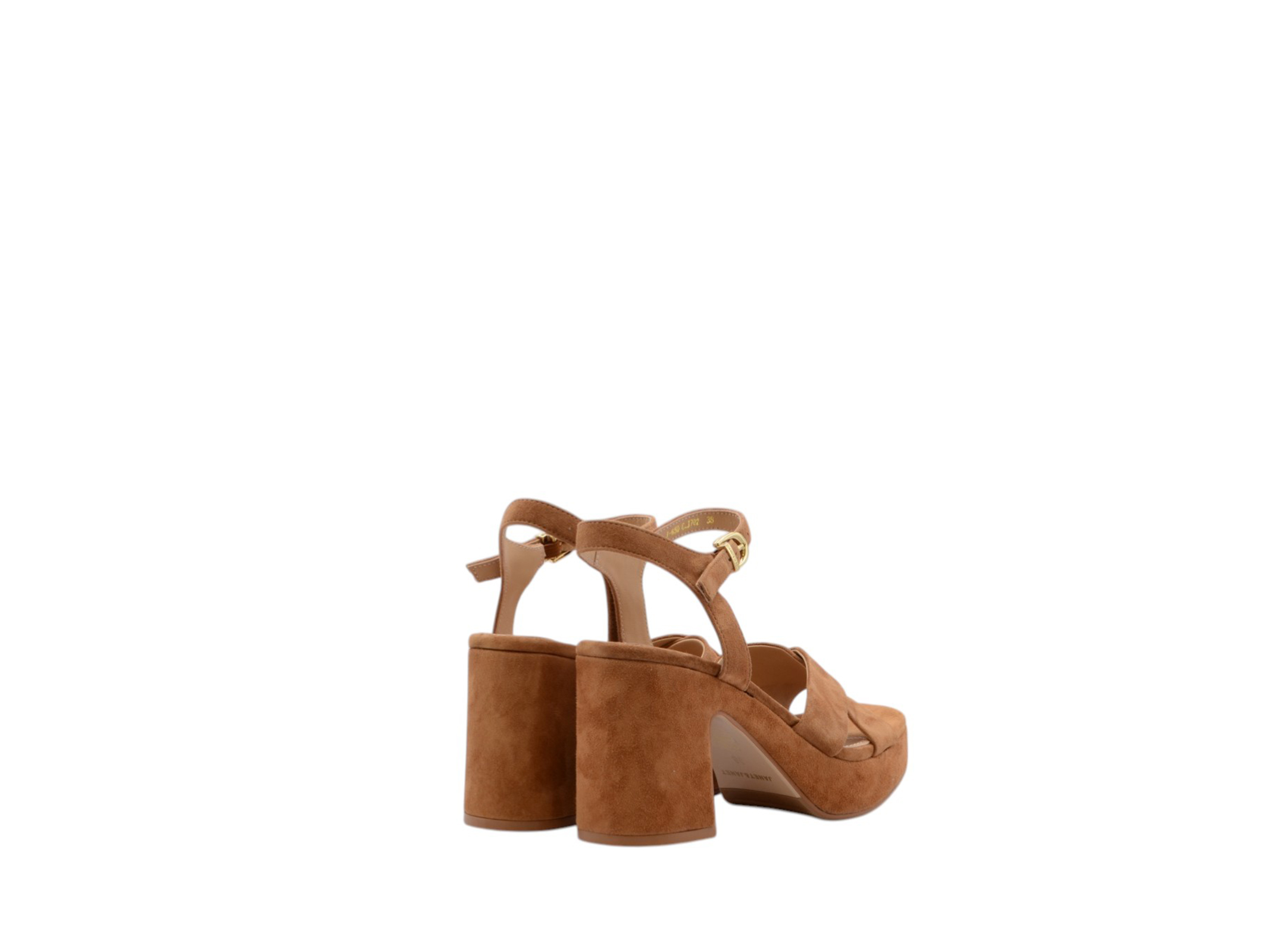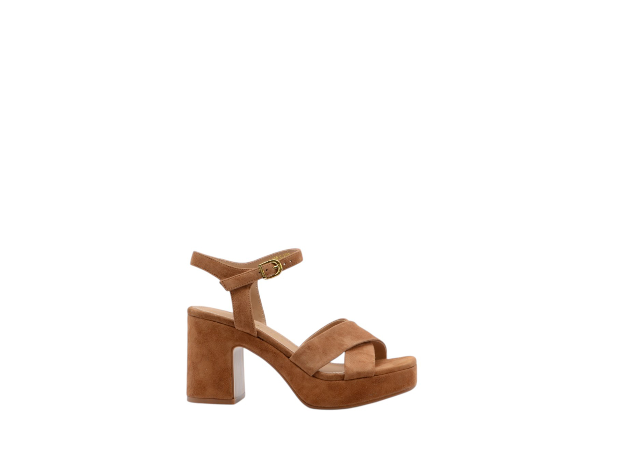 Sandalo incrocio con cinturino caviglia. tacco 80 plateau e suola in gommina antiscivolo. Tomaia in camoscio color cuoio