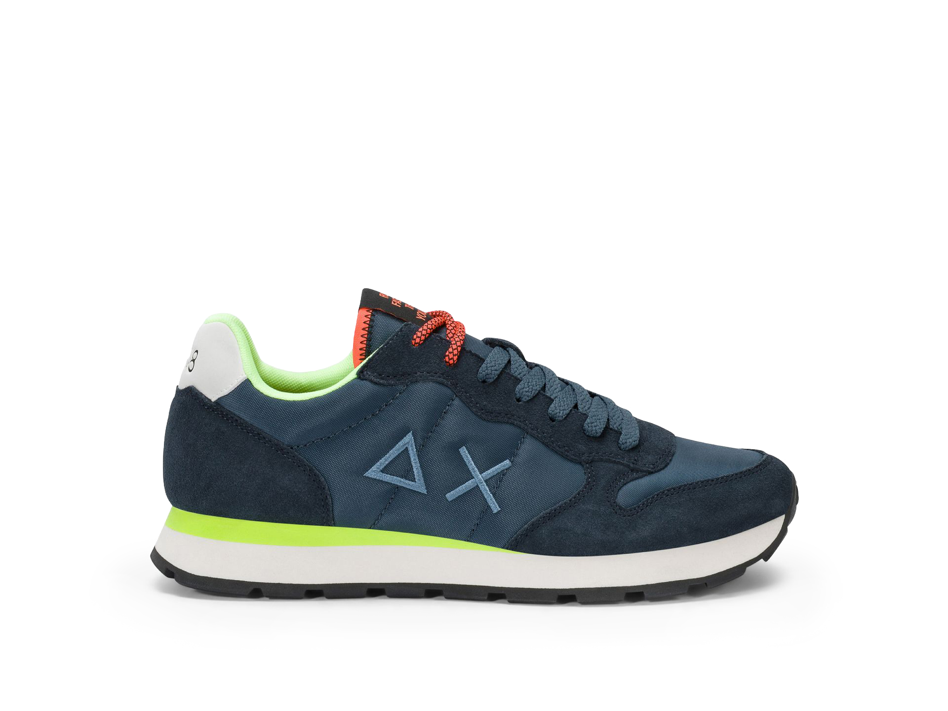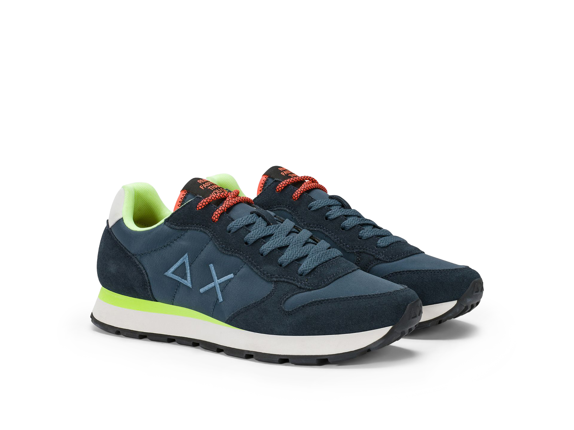 Sneaker con tomaia in camoscio e tessuto blu scuro con dettagli fluo.Secondo paio di stringhe bianche.Sottopiede estraibile.Suola in gomma