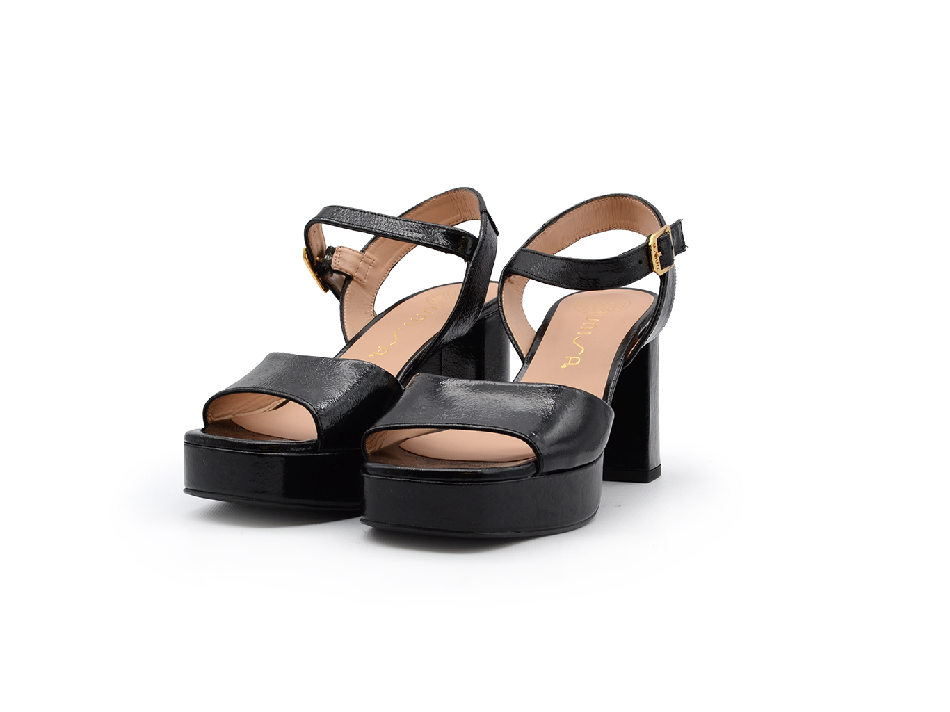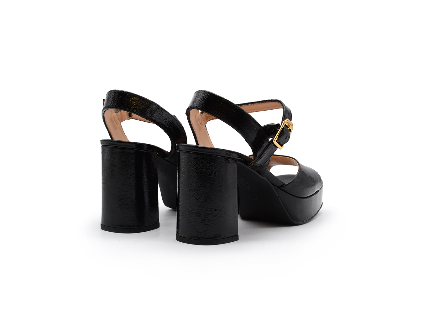 Sandalo con punta quadrata realizzato in pelle lucida. Tacco largo di 9 cm e plateau di 2,5cm rivestiti tono su tono. Fascetta regolabile alla caviglia con fibbia e suola in gomma leggera e antiscivolo. Un sandalo perfetto per questa estate.