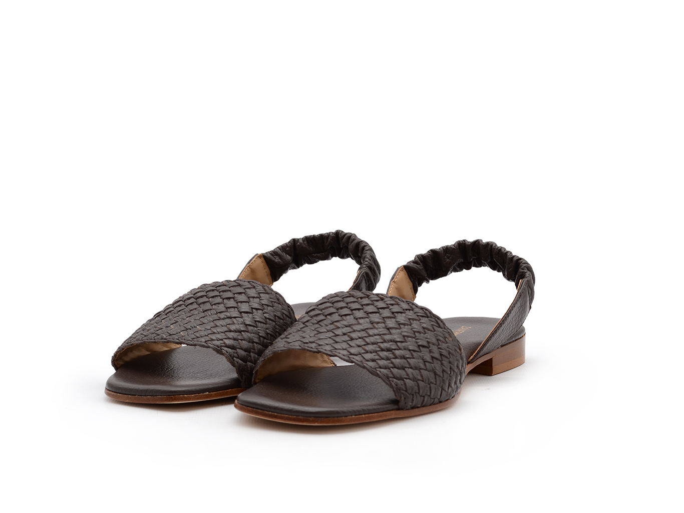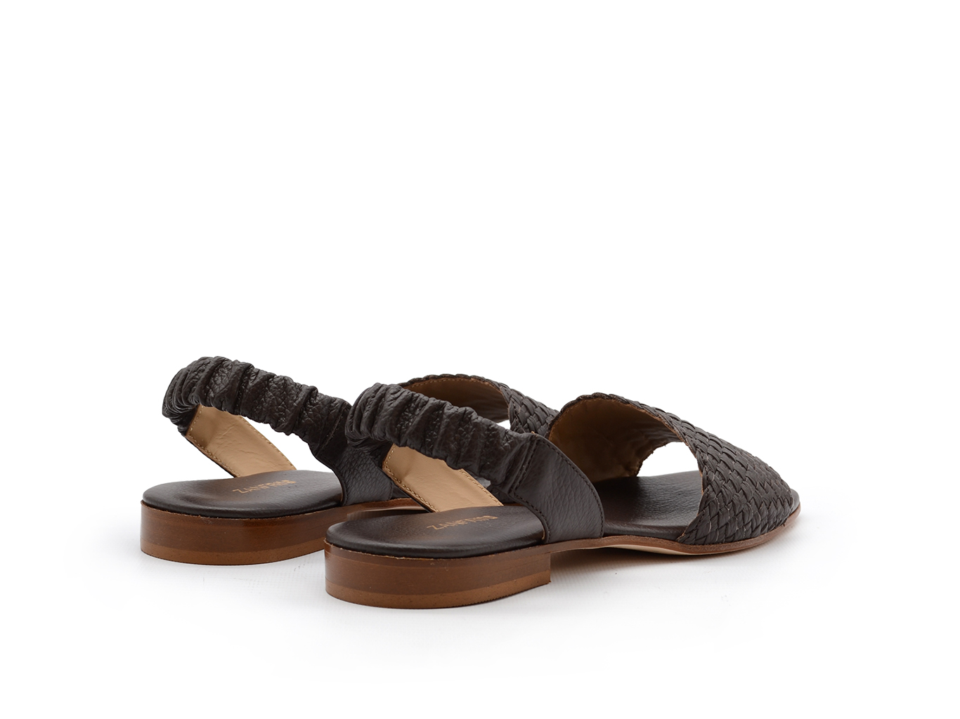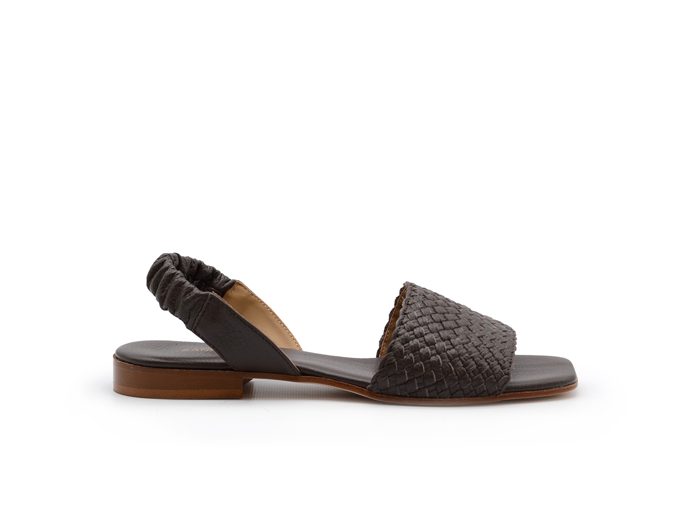 Sandalo Zanfrini in morbida pelle color testa di moro. Fascia in punta intrecciata. Elastico al tallone. Punta squadrata. Tacchetto 1 cm. Made in Italy